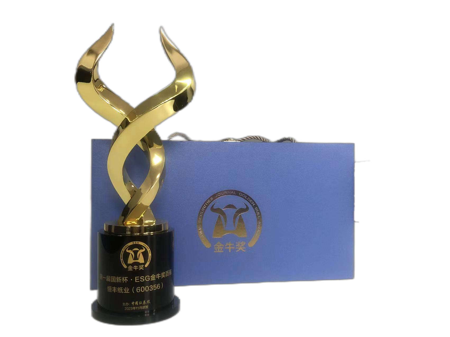 11月24日,由中国证券报、中国国新控股有限责任公司和南通市人民政府联合举办的“新生态新价值新成长——2023金牛企业可持续发展论坛暨第一届国新杯·ESG金牛奖颁奖典礼”在江苏南通举行,300余位上市公司高管、政府部门代表以及专家参加。会上,恒丰纸业荣获ESG金牛奖百强企业,标志着企业在深度践行ESG(环境、社会、治理)理念,引领新时代经济社会高质量发展方面达到先进水平。