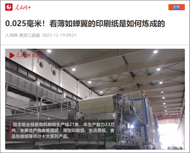 在恒丰产品系列中,36克微涂薄型印刷纸还有一个最小的弟弟,那就是人民网报道中提到的“薄如蝉翼的印刷纸”——今年研制成功的19克薄型印刷纸,其单页厚度只有0.025毫米,是现今世界上最薄的印刷用纸。产品带有微微的蓝色,可实现双面多色印刷,目前已飘扬过海,应用于故宫博物院词典类书籍及国外部分书籍的印刷。