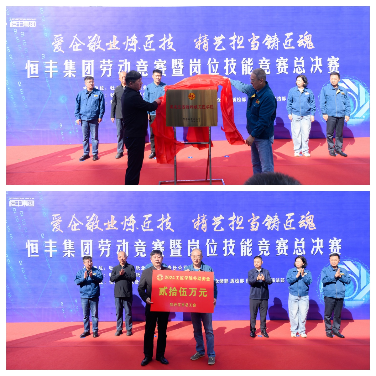决赛当天,牡丹江市总工会党组书记、常务副主席庞喜财与恒丰集团党委副书记、总经理李迎春共同揭牌,宣告“黑龙江省特种纸工匠学院”正式成立,同时发放了首批专项奖励资金25万元。全省共命名二十家工匠学院,恒丰纸业股份有限公司是牡丹江市唯一一家省级工匠学院。