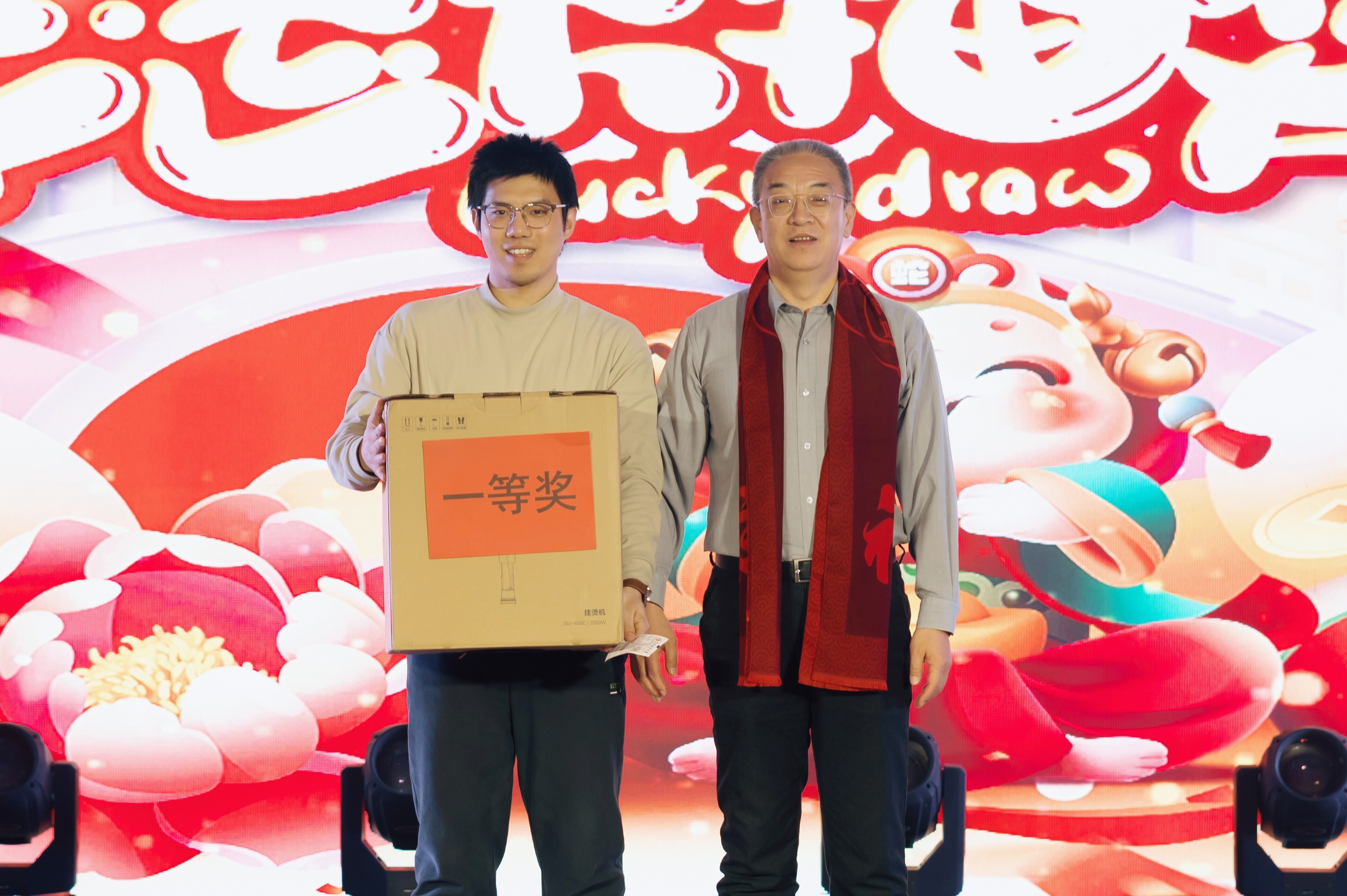 期间,现场互动游戏和幸运抽奖环节更是趣味横生,摄像机现场直播实现台上台下实时互动,欢声笑语不绝于耳。公司领导李迎春、梁德权、周再利分别为幸运获奖者颁奖,将喜悦与祝福传递给每一个人。