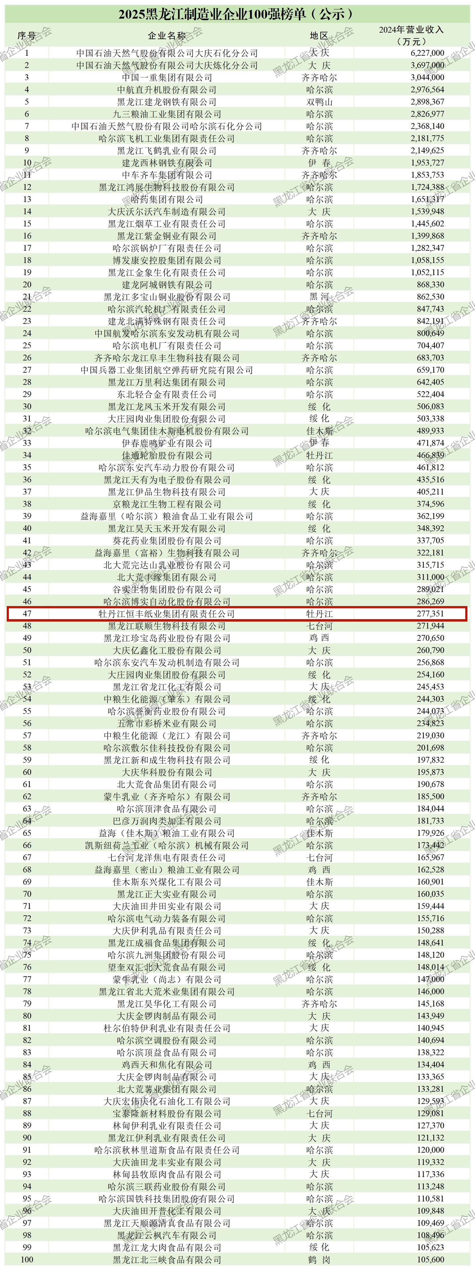 近日,黑龙江省企业联合会、省社会科学院、黑龙江日报联合发布2025黑龙江企业百强榜。在2025黑龙江企业100强榜单中,黑龙江省新产业投资集团有限公司位列第40位;在2025黑龙江制造业企业100强榜单中,牡丹江恒丰纸业集团有限责任公司位列第47位。