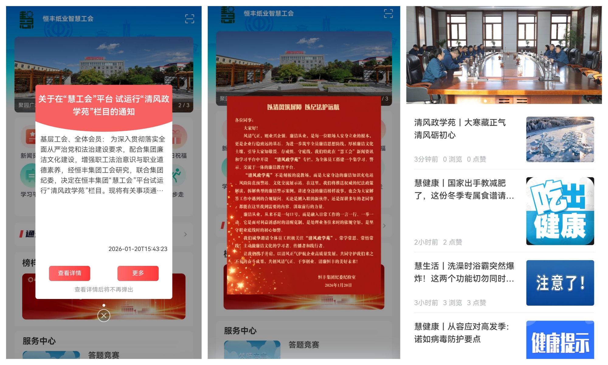 据工会工作人员介绍,“清风政学苑”栏目试运行自2026年1月20日启动,全体员工可通过两条便捷路径登录学习。路径一:员工登录OA系统后,进入公司门户完成系统登录,点击进入“慧工会”平台,在“新闻资讯、学习平台”板块即可找到栏目入口;路径二:员工关注“牡丹江恒丰纸业股份有限公司”公众号,通过公众号内“智慧工会”入口进入“慧工会”平台,在“新闻资讯、学习平台”中也能直接访问。此外,栏目配套推出学习激励机制,员工参与学习可获得“智慧工会”登录积分与学习积分,积分可按平台现有规则兑换相应服务或物品,实现“学习有收获、参与有动力”的双向赋能。
