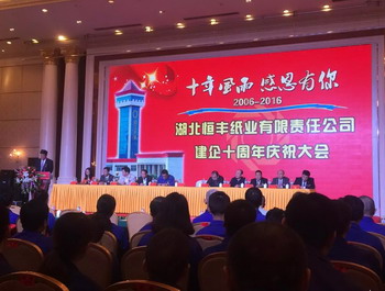 湖北恒丰纸业有限责任公司建企十周年庆祝大会在碧桂园酒店会议中心举行。参加活动的湖北恒丰110名员工与到会嘉宾们纷纷在题名墙前题名留念。9时30分,在《国歌》声中,庆祝大会正式开始。